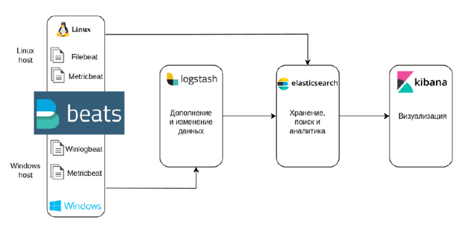 Компоненты Beats могут доставлять данные как напрямую в Elasticseach (пример с Linux хостом), так и в Logstash (Windows хост). Logstash выполняет дополнительную работу по обогащению или трансформации собранных данных и отправляет данные в Elasticsearch. Elastichsearch принимает и индексирует полученные данных. Kibana позволяет настроить необходимую визуализацию полученных данных.